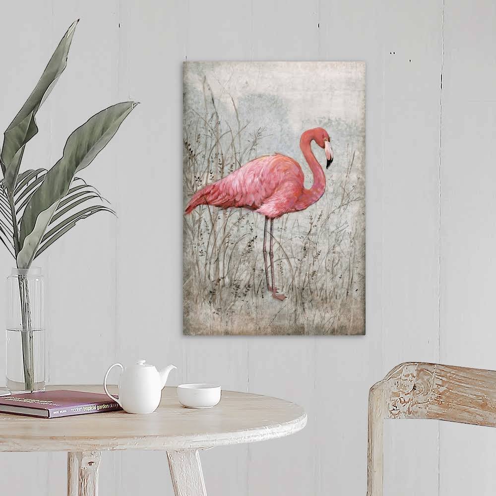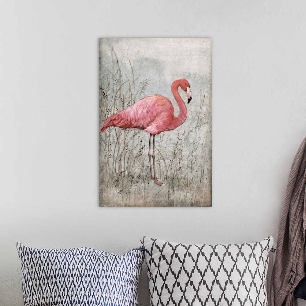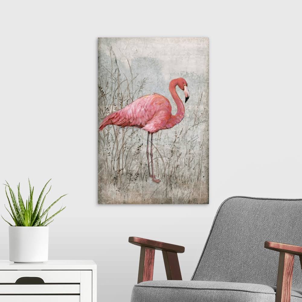 Premium Thick-Wrap Canvas entitled 'American Flamingo I'. available. Primary colors within this image include: Silver, Dark Forest Green. Made in the USA. All products come with a 365 day workmanship guarantee. Archival-quality UV-resistant inks. Canvas is a 65% polyester, 35% cotton base, with two acrylic latex primer basecoats and a semi-gloss inkjet receptive topcoat. Canvas is acid-free and 20 millimeters thick.