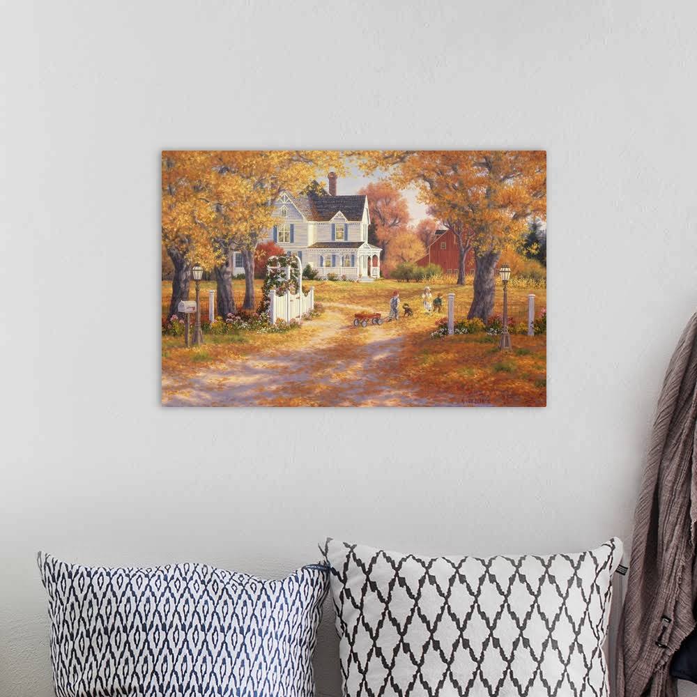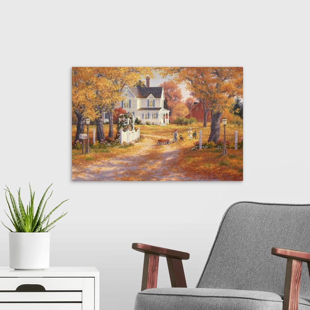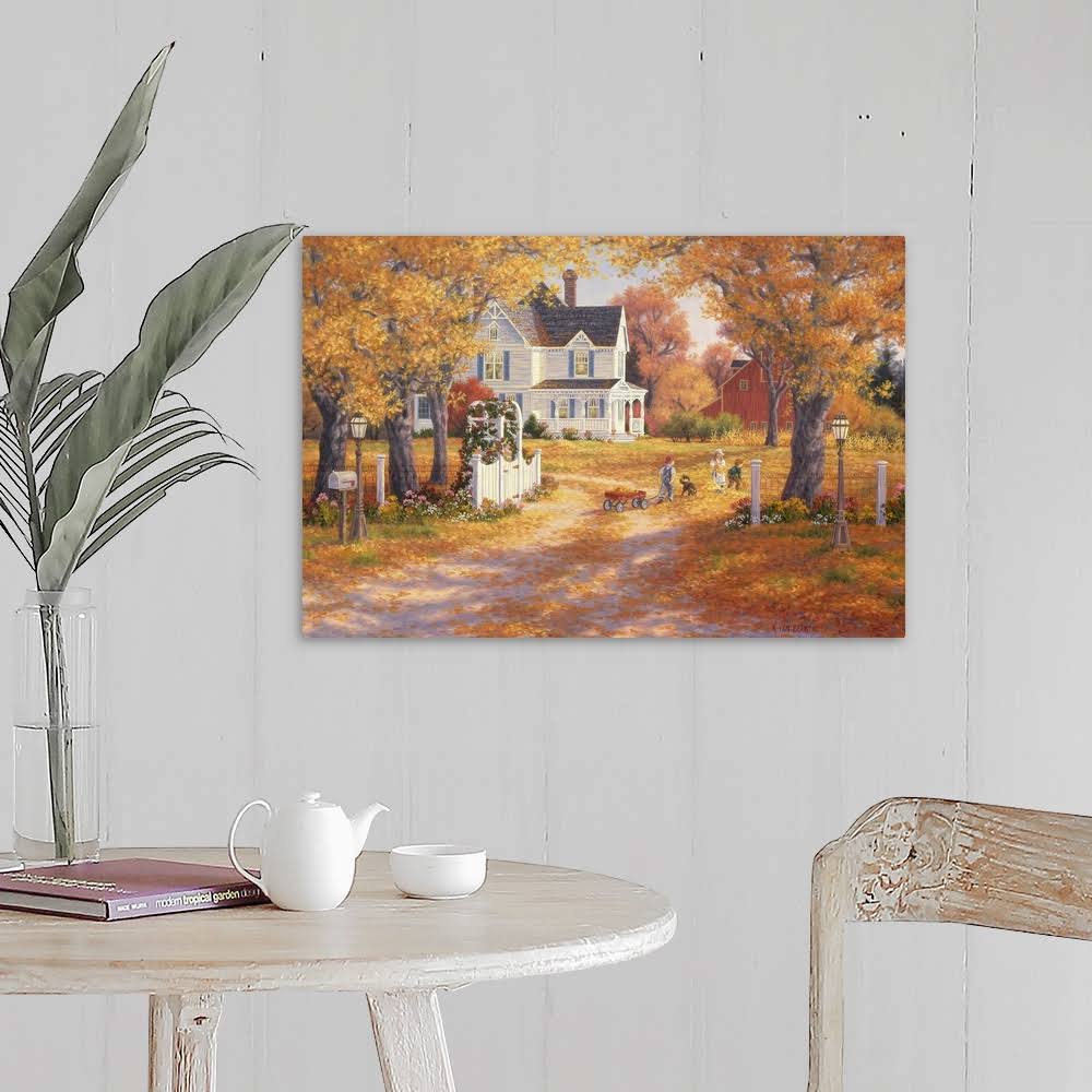 Premium Thick-Wrap Canvas entitled 'Autumn Leaves And Laughter'. Children playing in leaves with wagon in front of house. available. Primary colors within this image include: Brown, Peach, Black, Silver. Made in the USA. All products come with a 365 day workmanship guarantee. Inks used are latex-based and designed to last. Canvas is acid-free and 20 millimeters thick. Museum-quality, artist-grade canvas mounted on sturdy wooden stretcher bars 1.5 thick. Comes ready to hang. Age Group: kids. Pattern: solid.