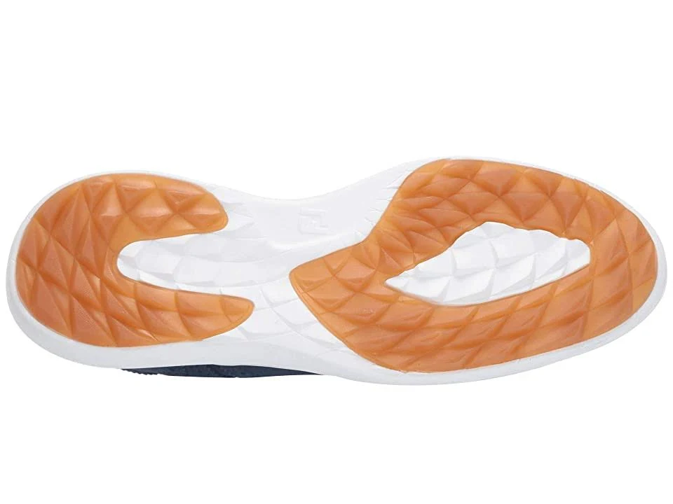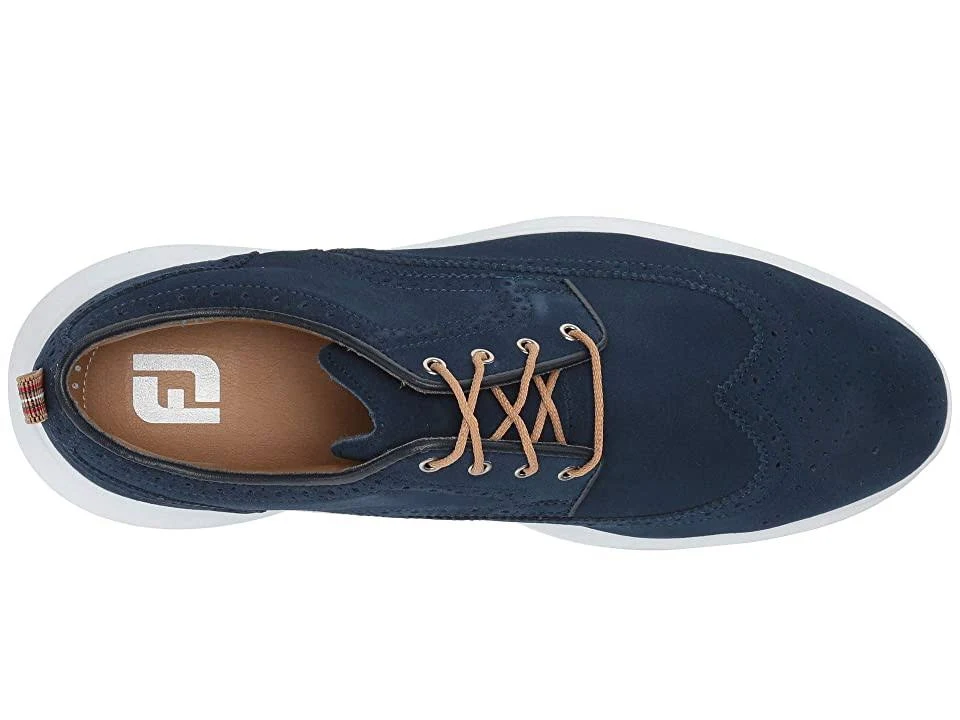 Color: Navy. Gender: Men. FootJoy's Flex Wing-Tip spikeless golf shoe features a suede upper that is silky, soft, and smooth. It also features a multi-layer fitbed that offers extreme comfort and an EVA midsole that is cushioned for support and softness. The outsole features Versa-Trax on/off course traction technology. This technology includes traction pods that maximize surface gripping. It also includes optimized traction elements that provide superior grip for on course, off course, and hard wet surfaces.