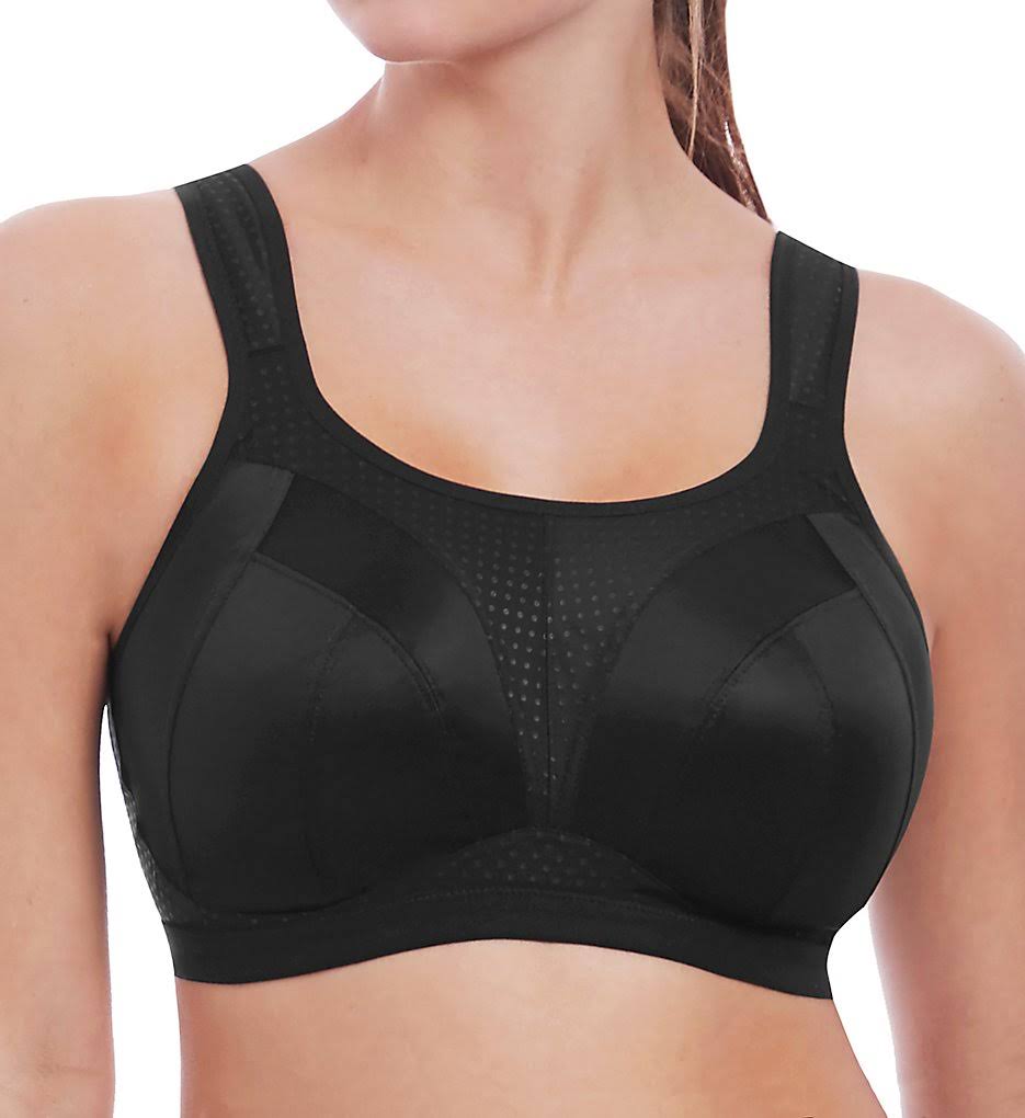 Freya AA4014 Active Dynamic Wirefree Hi-Impact Sports Bra Jet 36GG Get active in this smartly designed and constructed woven fabric sports bra that offers bounce control and supportive fit without wires. This sports bra delivers complete support yet is extremely lightweight. Made of nylon, polyester and elastane. Wireless, non-stretch multipart cup has angled and vertical seams for support and is unlined (unpadded). Support panels are integrated into sides of cups, and work with top cup panels to hold breasts in place. Breathable, woven insets at front top, center and sides have a reflective monochrome dot print. Scoop neckline gives you full coverage and maintains close contact with a sewn-on elastic edge. Soft elastic underband along bottom adds stability and holds bra close to you. Tall, smoothing microfiber sides and back have horizontal stretch to allow for motion and more support, with elastic edge at top and bottom. Wide, padded, center-pull front straps help to distribute weight and relieve stress. Back straps have no give and are adjustable with coated metal hardware. Movable J-hook connects straps into a racerback. Soft thread at seams helps prevent irritation. Sizing up to J cups. Hook-and-eye closure has a soft cloth underside and hooks together with coated metal hardware. See Fitter's Comments below for hook count. Perfect for going on a run and higher impact exercise classes.