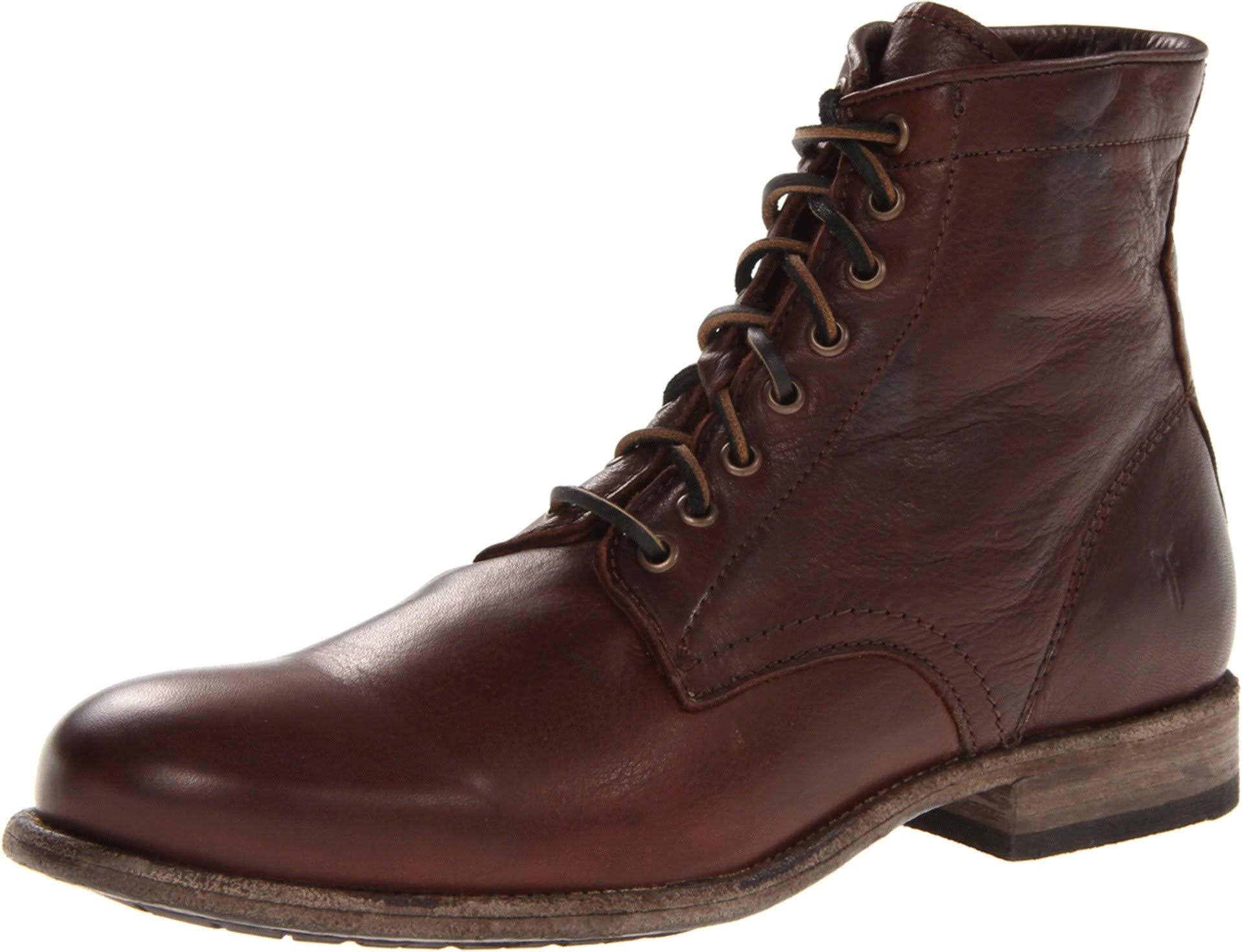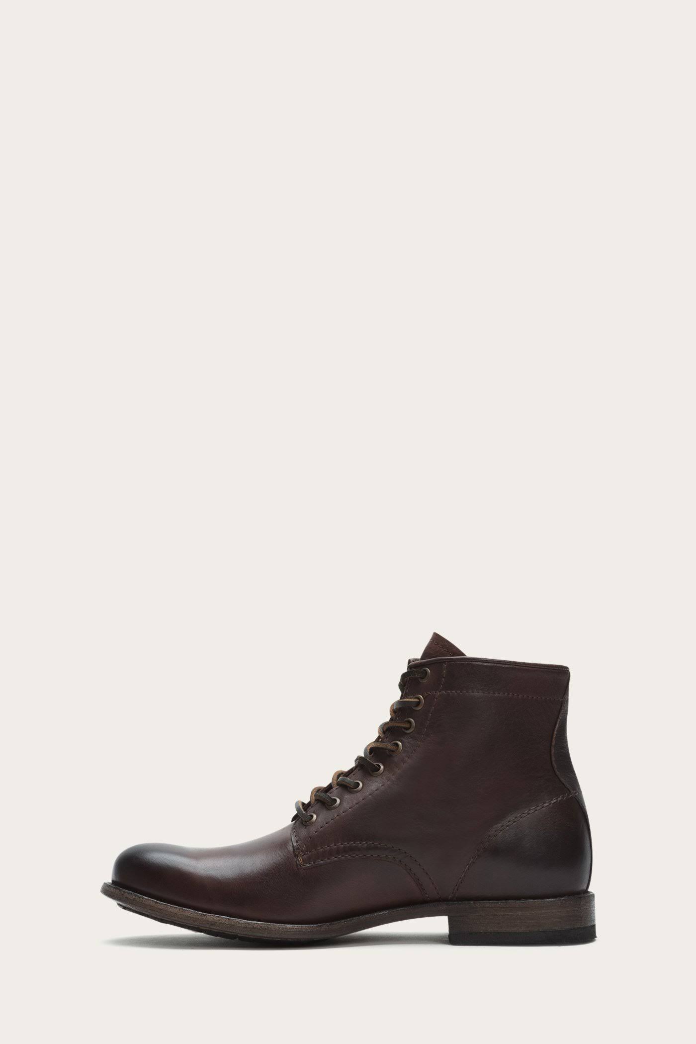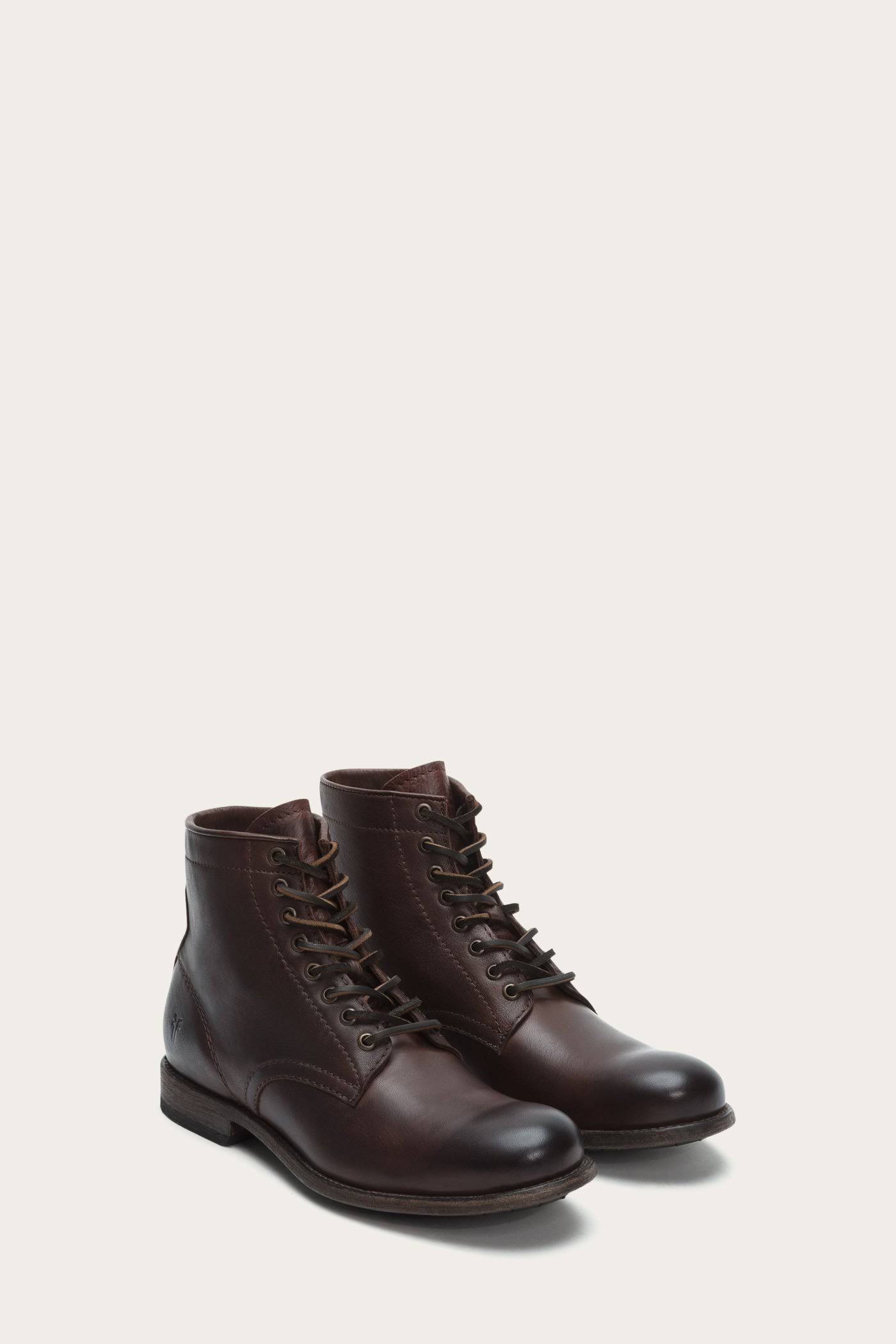 Vintage italian leather construction. Rawhide leather laces. Precision stitching. Leather lining. Lightly cushioned leather insole. Leather outsole with rubber inserts. 5.5 lace up shaft. Frye boots are perfect for the man who can't be defined by one style or look. These Tyler Lace Up Boots are crafted from soft vintage Italian leather, and feature Rawhide leather laces, and precision stitching for a classic look. These men's lace up leather boots also feature durable leather outsoles with rubber inserts for added traction, and lightly cushioned leather insoles for all-day comfort. No matter where you may be heading to, Frye has the perfect boots for you.
