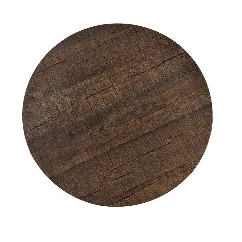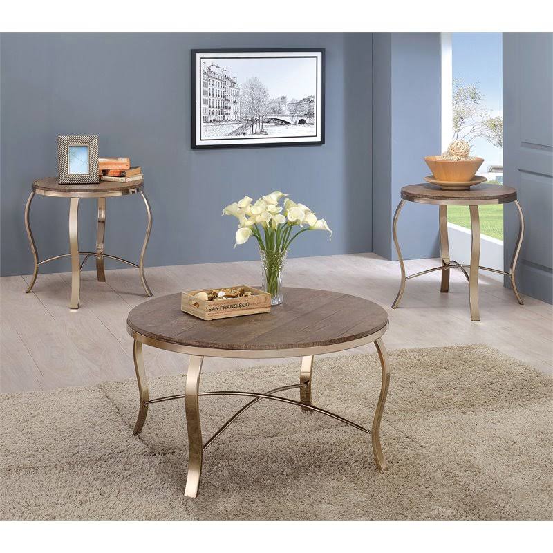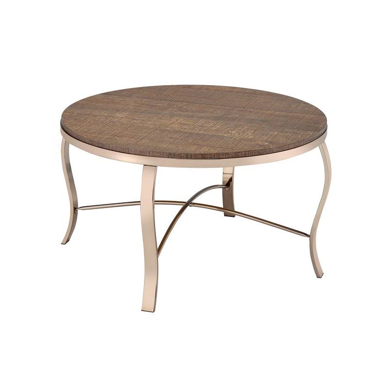 The wavy table legs are constructed from sturdy metal in a warm champagne finish and are supported by additional bars within the base. The round oak tabletop provides ample space for placing books, lamps and more.