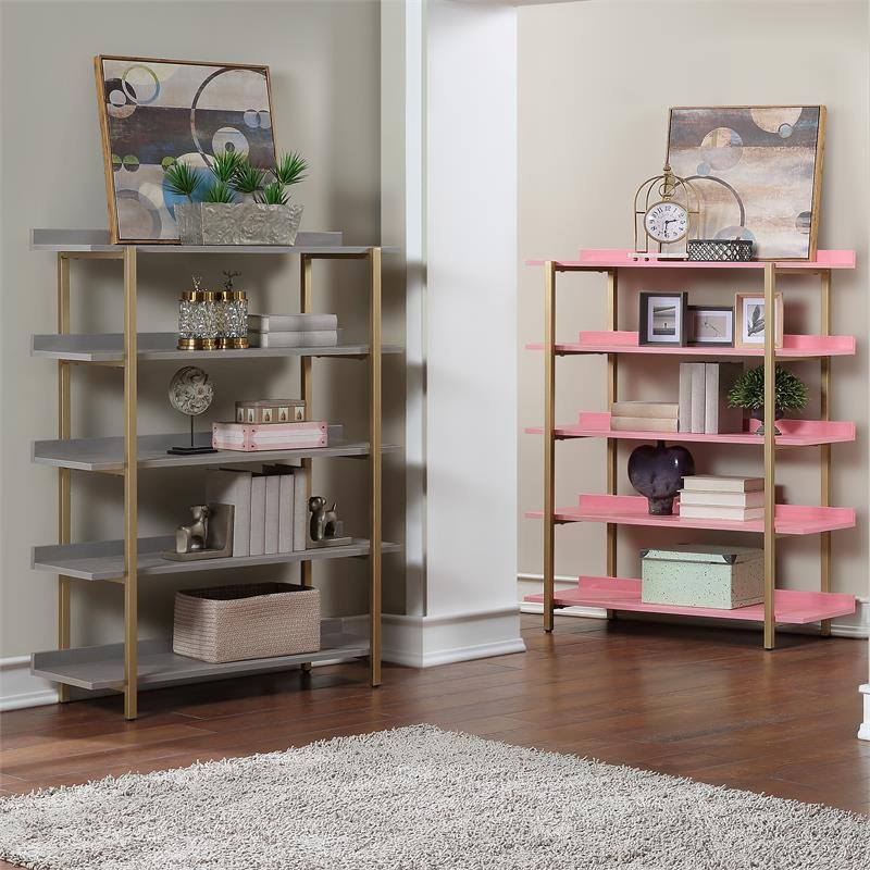 Open and eye-catching, this contemporary antique gray wood five-tier bookcase doubles as a room divider to define an open concept living space. It's a bold design that combines a rich gold finish frame with colored shelves. Shelves are stacked one on top of another to create a vertical display space with an open back, adding exquisite versatility. Add baskets for storage or create a lovely display of personal treasures.