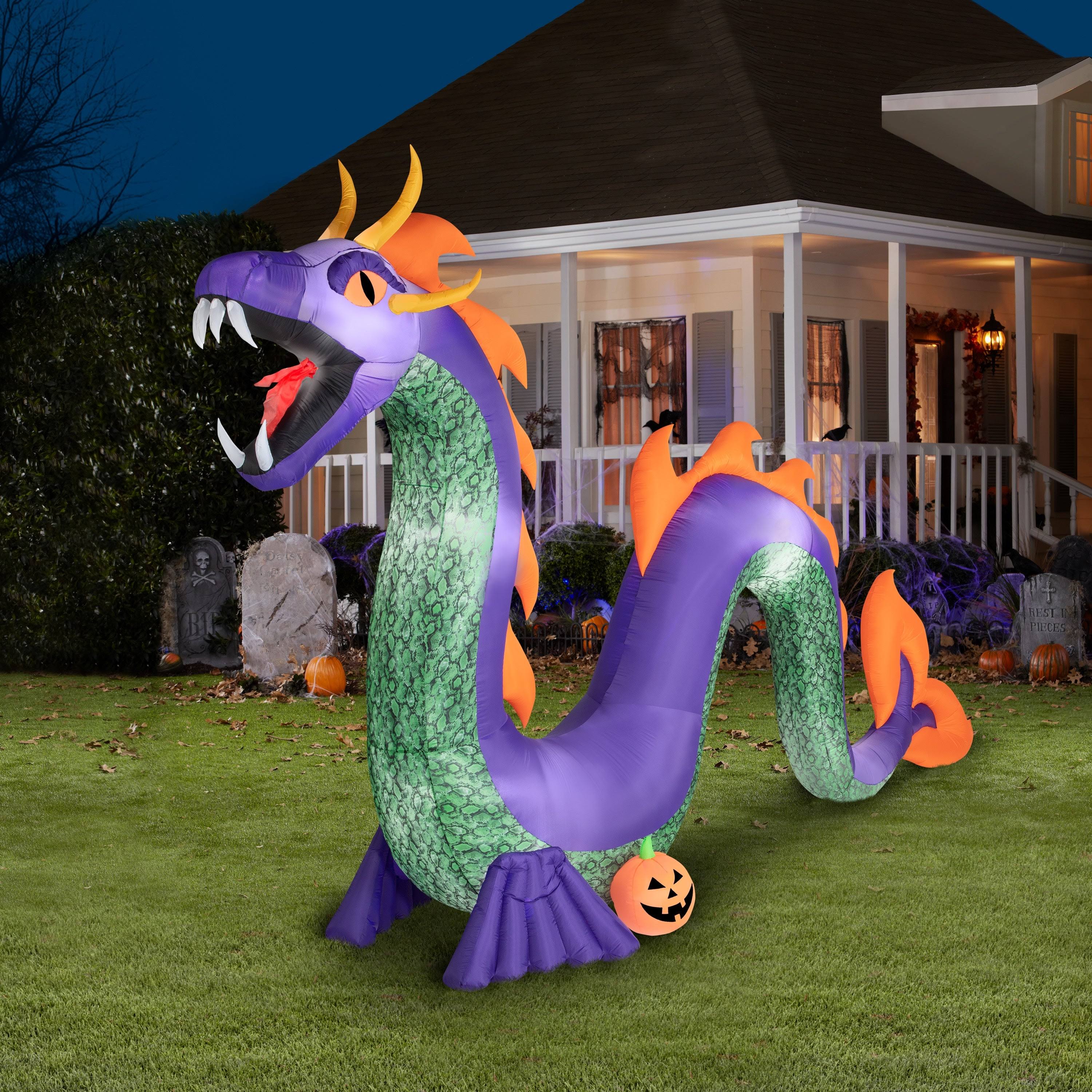 Frighten your guests with this amazing Airblown inflatable character. The serpent lights up and features a flaming mouth. It self-inflates in seconds and comes with everything needed for easy outdoor setup. Just plug it in, stake it down and watch the magic unfold. Display this cute Halloween decoration as a standalone or combine it with other Airblown Inflatables to create a custom scene.
