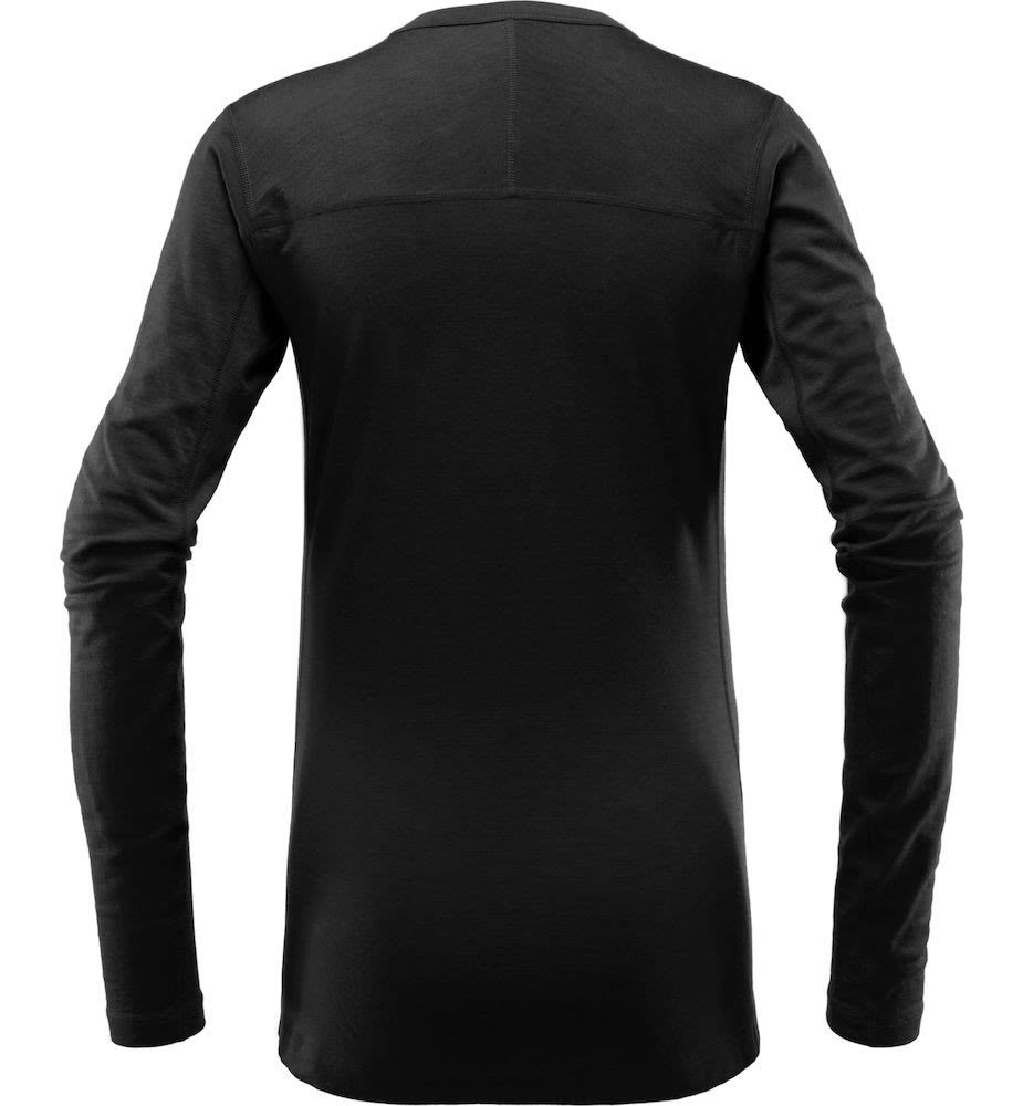 Womens versatile warm underwear. Color: True Black - Size: S - The Actives Wool Roundneck by Haglofs for ladies is a versatile shirt and perfect as a next-to-skin layer, with contoured fabric and comfortable, offset flatlock seams. The wool oft the Actives Wool Roundneck by Haglofs used in its construction offers excellent thermal properties and a good fit. As a bonus, the natural fibres offer odour control that makes it useful during an active day. - Next to skin comfort: made from a smooth fabric with exceptional warmthto-weight ratio - Wool fibres increase thermal qualities while elastane enhances fit and comfort - Natural odour control - Stretch fabric throughout to allow maximum freedom of movement - Flatlock seams for maximum comfort against the skin - Offset seams in key areas help prevent chafing - Weight: 195 g - Outer material: 96% Merino wool, 4% Elastane, mulesing free, super fine (18.5 micron) merino wool jersey, with excellent fitting properties thanks to the added elastane share, 205 g/m虏 - Material characteristics: breathable, elastic, insulated - Material outer fabric: 4% elastane, 96% Wool (Merino) - Outer fabric: Elasthan, Merino Wool