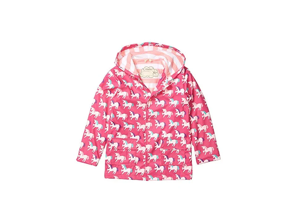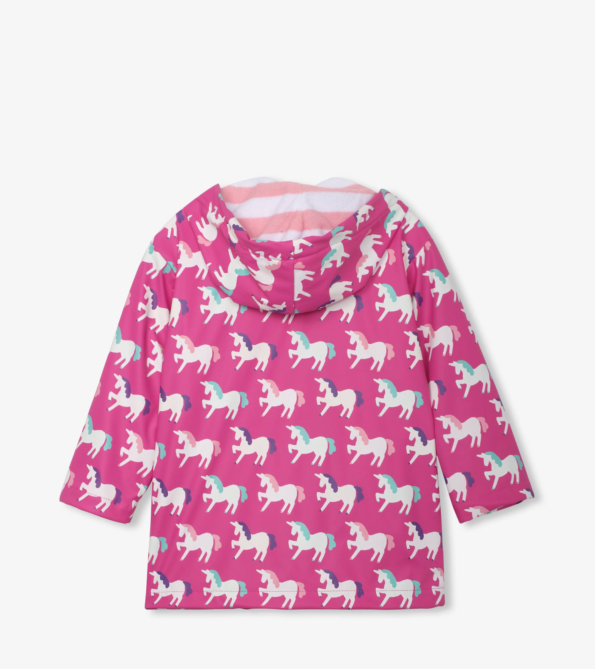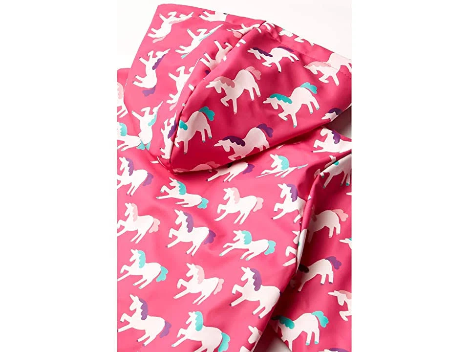 Rain or shine, the fun doesn't stop when they're wearing this mystical unicorns colour-changing raincoat! Rain coat, Long sleeve, Hooded, Front snap closure, All over print, Fully lined, Waterproof and PVC-free, Hand pockets, 100% Polyurethane.