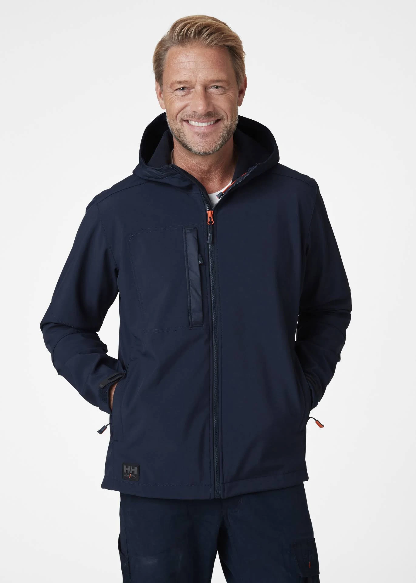 The Kensington Hooded softshell jacket is an excellent choice for the tradesmen who values ease and practicality. The high collar has a brushed fleece inside and the back is extended for improved comfort. It has multiple conveniently placed Ykk zipper pockets and the chest pocket is outfitted with a cord hole for headphones that alleviates any unnecessary tangling. Main fabric: Face: 94% Polyester, 6% Elastane, 305 g.