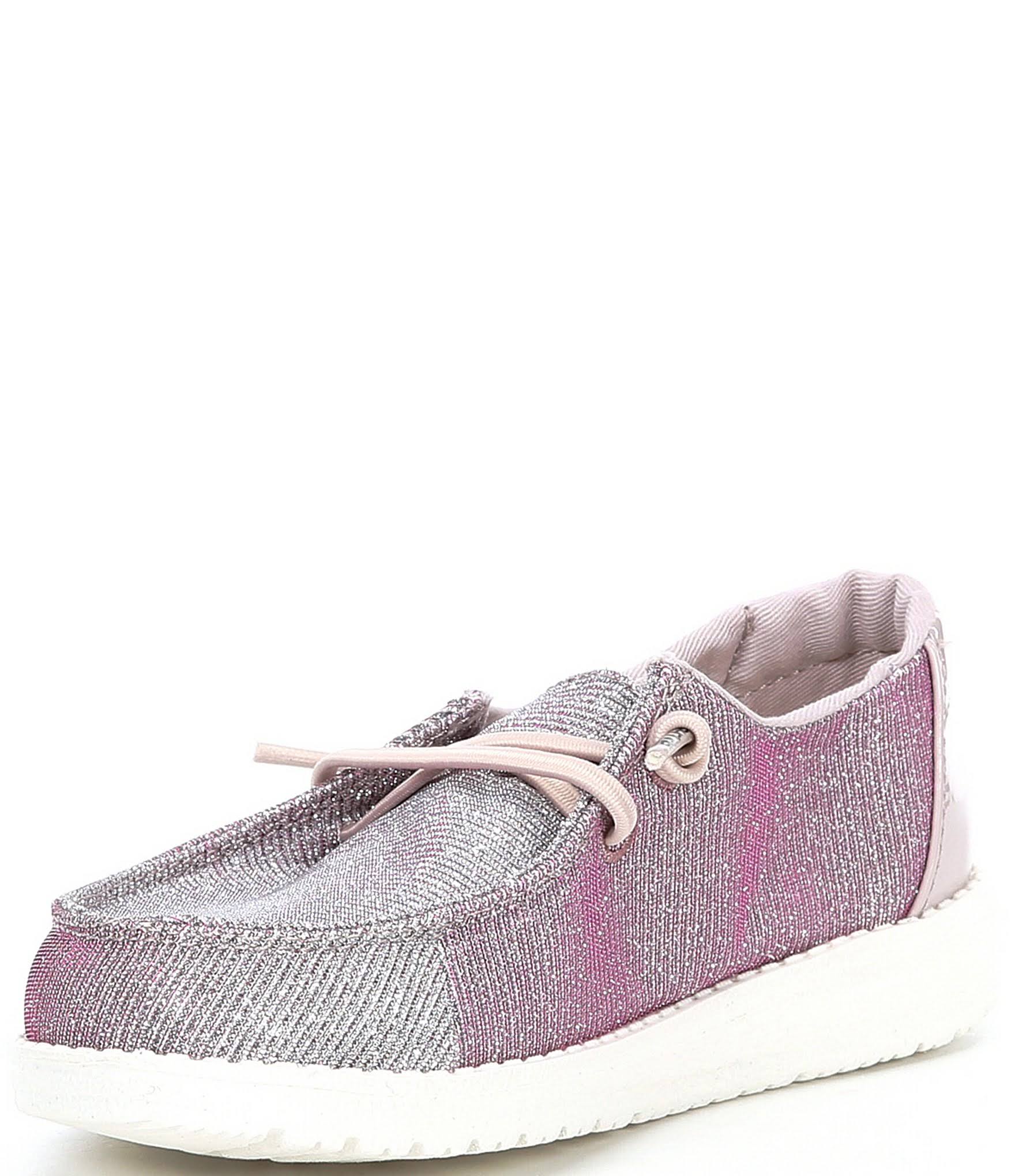 Wendy youth shoes are like walking on little fluffy marshmallows. Slip on style loafer is perfect for all of her day's adventures. Style number: 130123096. Disco pink cotton canvas upper. Ultra-lightweight flexible outsole. Aerated memory foam insole. Lined with soft patterned cotton. Machine washable (cold). 4 oz. total weight per shoe.