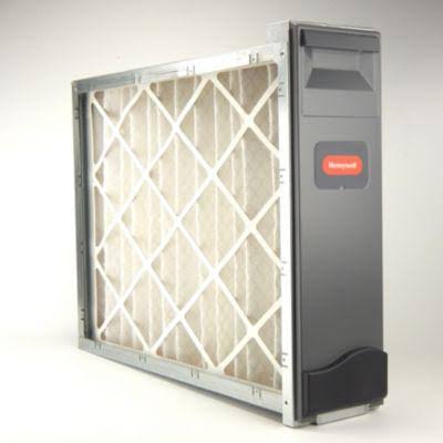 The F100F Media Air Cleaner captures a significant amount of the airborne particles from the air circulated through the unit. Recommended as the basic minimum air quality product. The F100F Media Air Cleaner includes cabinet, access door and FC100A pleated media filter, and W8600A Airwatch Indicator (optional on some models). High efficiency media filter captures particles as small as 0.3 microns. Applicable to all gas, oil and electric forced air furnaces and to compressor cooling up to 5 tons. Mounts in the return air duct. Rugged zinc-coated, roll-formed cabinet resists corrosion and can support weight of residential furnace and evaporator coil.