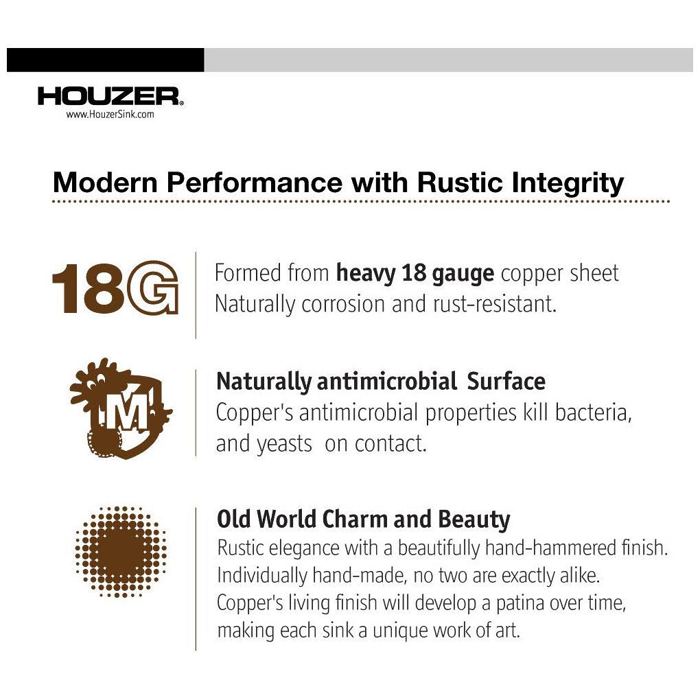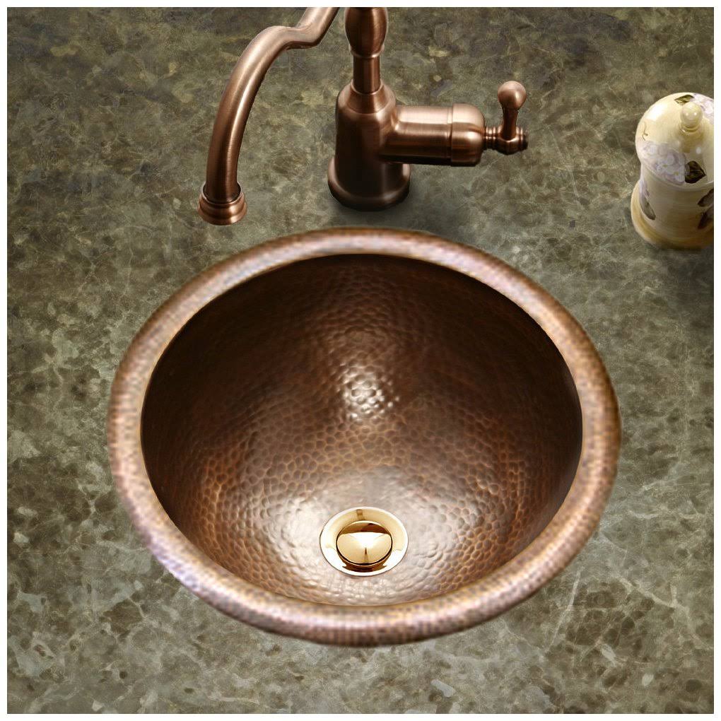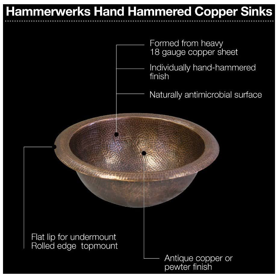 Houzers HW-BAB1RS embraces an authentic design that stands out and brings with it that sought-after whimsical look. It is a petite round lavatory sink that creates a vintage look with its design. It features a hand hammered copper style that boasts intricate handcraftsmanship. Constructed from heavy and highly-durable materials, this sink is tough and unrelenting, assuring a long product life. The Houzer Hammerwerks Self-Rimming Sink is 4-5/8 inches deep with an overall diameter of 11-3/4 inches. It includes an overflow and utilizes a 1-1/2-inch drain opening. More details are available in the specification sheet. This Houzer Antique Copper Sink offers an extraordinary blend of elegance and function.