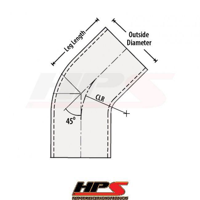 HPS 2.5 45 Degree Bend 6061 Aluminum Tubing 16 Gauge with 6 Leg Length and 2 1/2 Center Line of Radius is ideal for intake, cooling systems and turbo intercooler piping setup because 6061 aluminum is the most popular and versatile alloy, and is the least expensive of the heat treatable aluminum alloys. HPS 2.5 45 degree bend aluminum round tubing is sold in the T6 condition, ideal for sawing, machining, sanding, and polishing. The 45 degree aluminum tubing elbow can be polished, but due to the softness of the aluminum, care must be taken not to remove too much material, especially in the area near any welds. All aluminum tubing sold by HPS are made in the USA. Technical Specification Material: 6061-T6 Aluminum Tubing Outside Diameter: 2.5 Wall Thickness: 16 Gauge Leg Length on each side: 6 Center Line of Radius: 2 1/2 Remark: HPS does NOT recommend 6061 Aluminum to be used for exhaust systems.