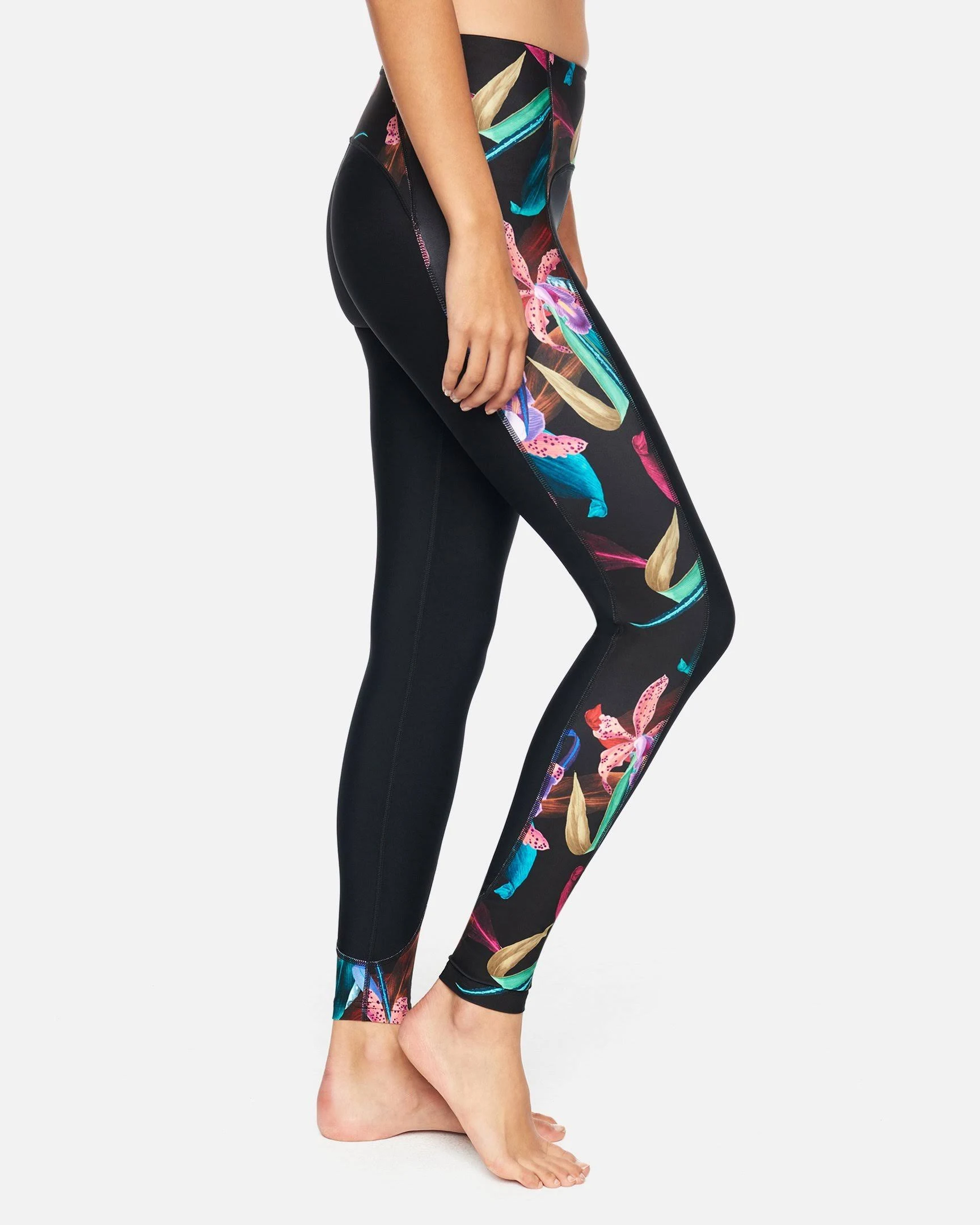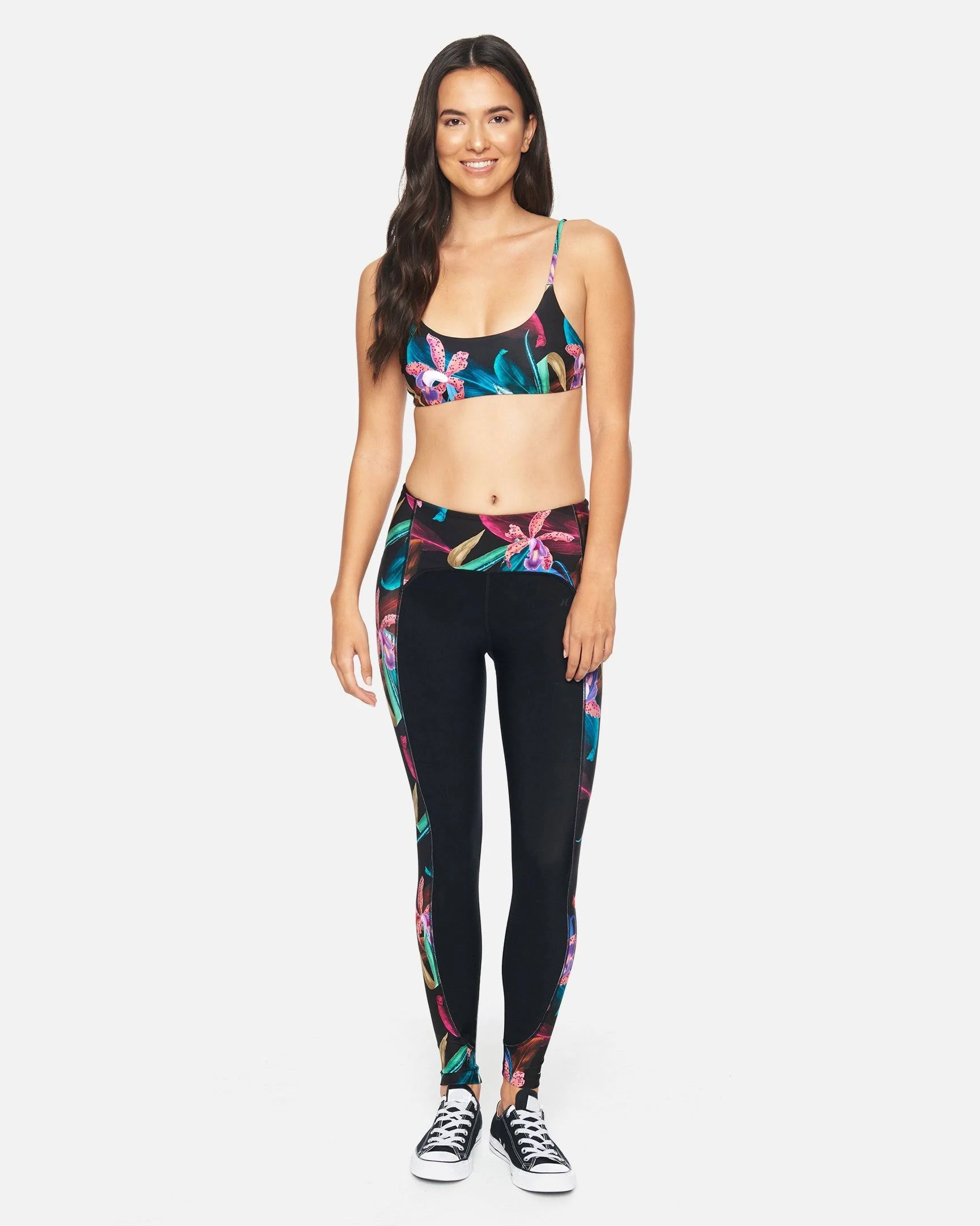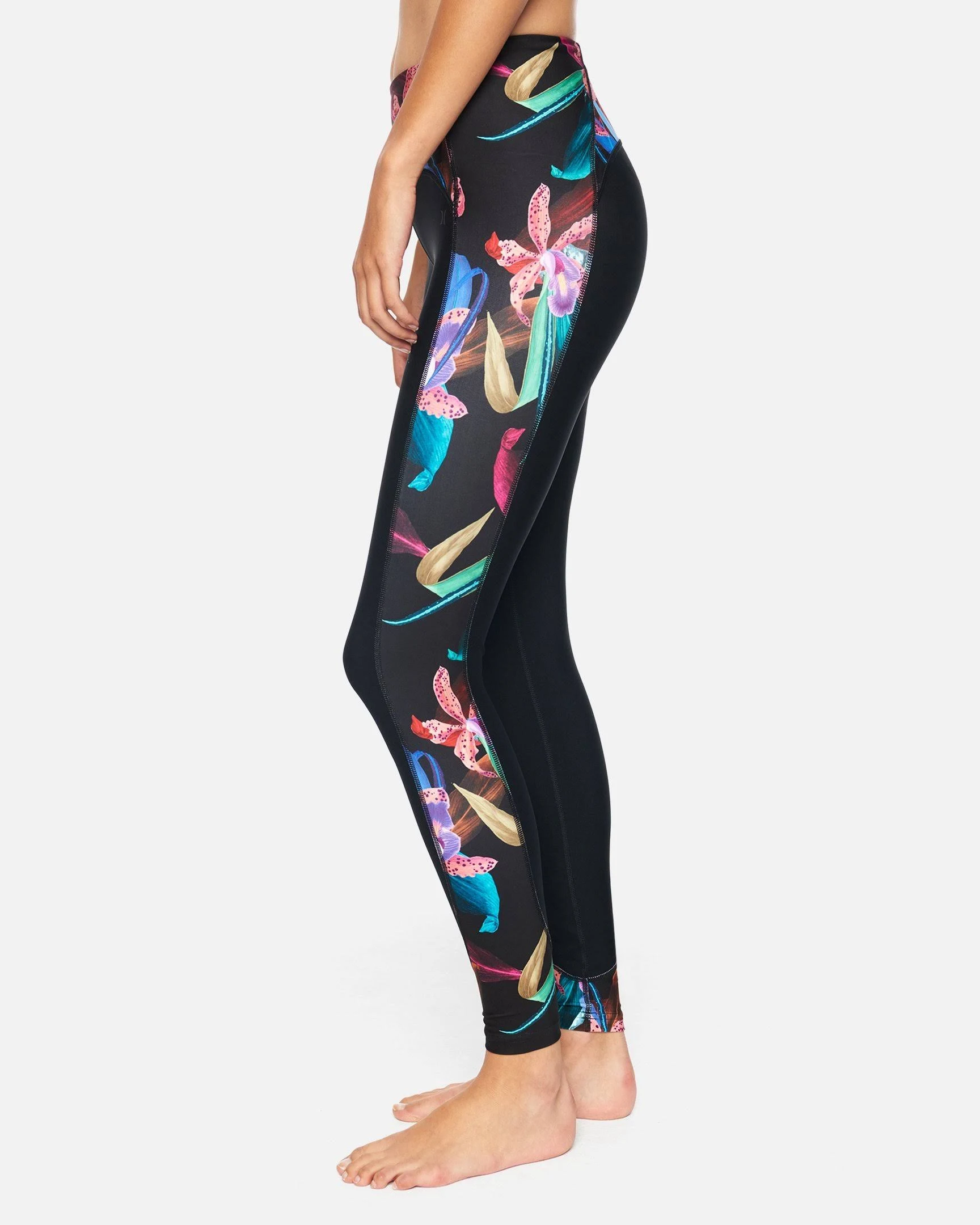 The Hurley Orchid Snack Hybrid Legging features hybrid fabric in a stretchy fit that's sure to support you all day long. A tropical print down the sides adds a pop of color and fun. Details Quick Dry & DWR Coated. UPF 50. Compressive Fit. 26. 79% Polyester / 21% Spandex. 4 Waistband & 26 inseam. Stretch waist full length tight with printed side panels. Hurley icon heat transfer.