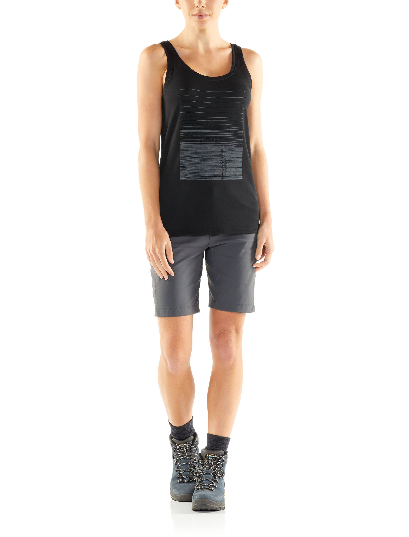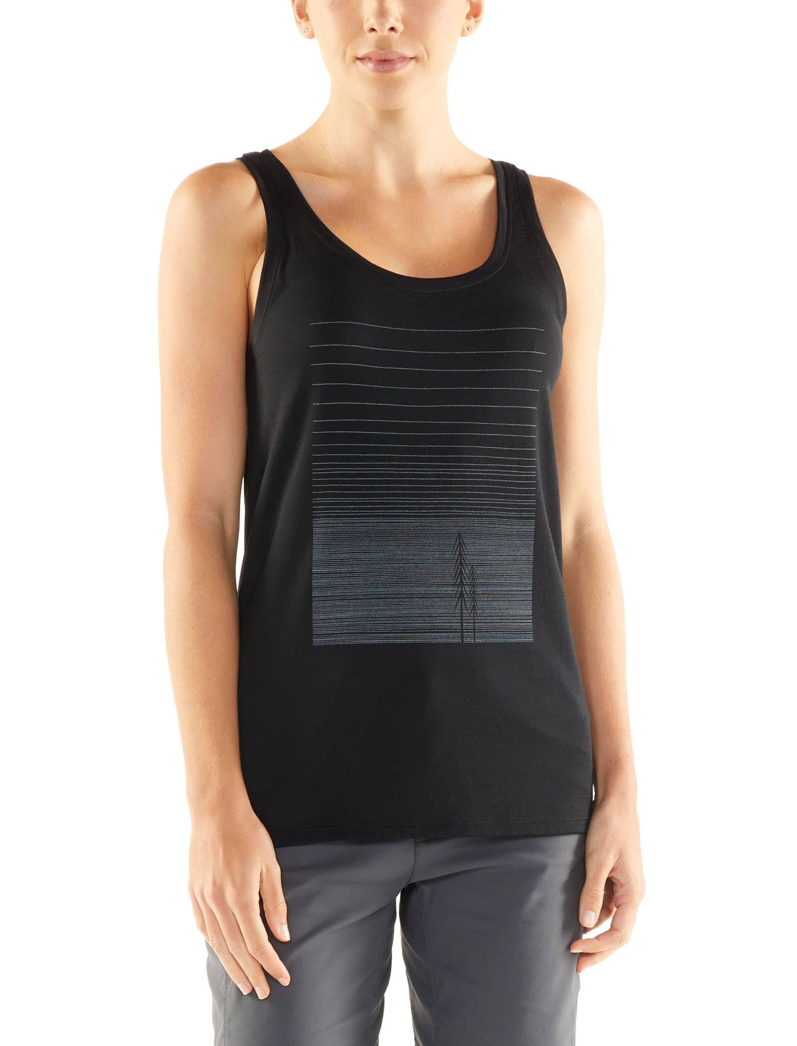 The tank top version of one of our most iconic tees, the Tech Lite Tank Woods is a lightweight, stylish option for your adventures outdoors and in life. It's made with our beautifully soft 150gm jersey fabric, which comprises corespun fibers of merino wool wrapped around nylon for enhanced durability and a lovely feel next to the skin. Hard to beat for comfort in the heat, it has a scooped neck for a feminine look and fit and forward-set side seams for added comfort. The original screen print by Stu Forsyth adds a contemporary graphic element. The tank top version of one of our most iconic tees, the Tech Lite Tank Woods is a lightweight, stylish option for your adventures outdoors and in life.