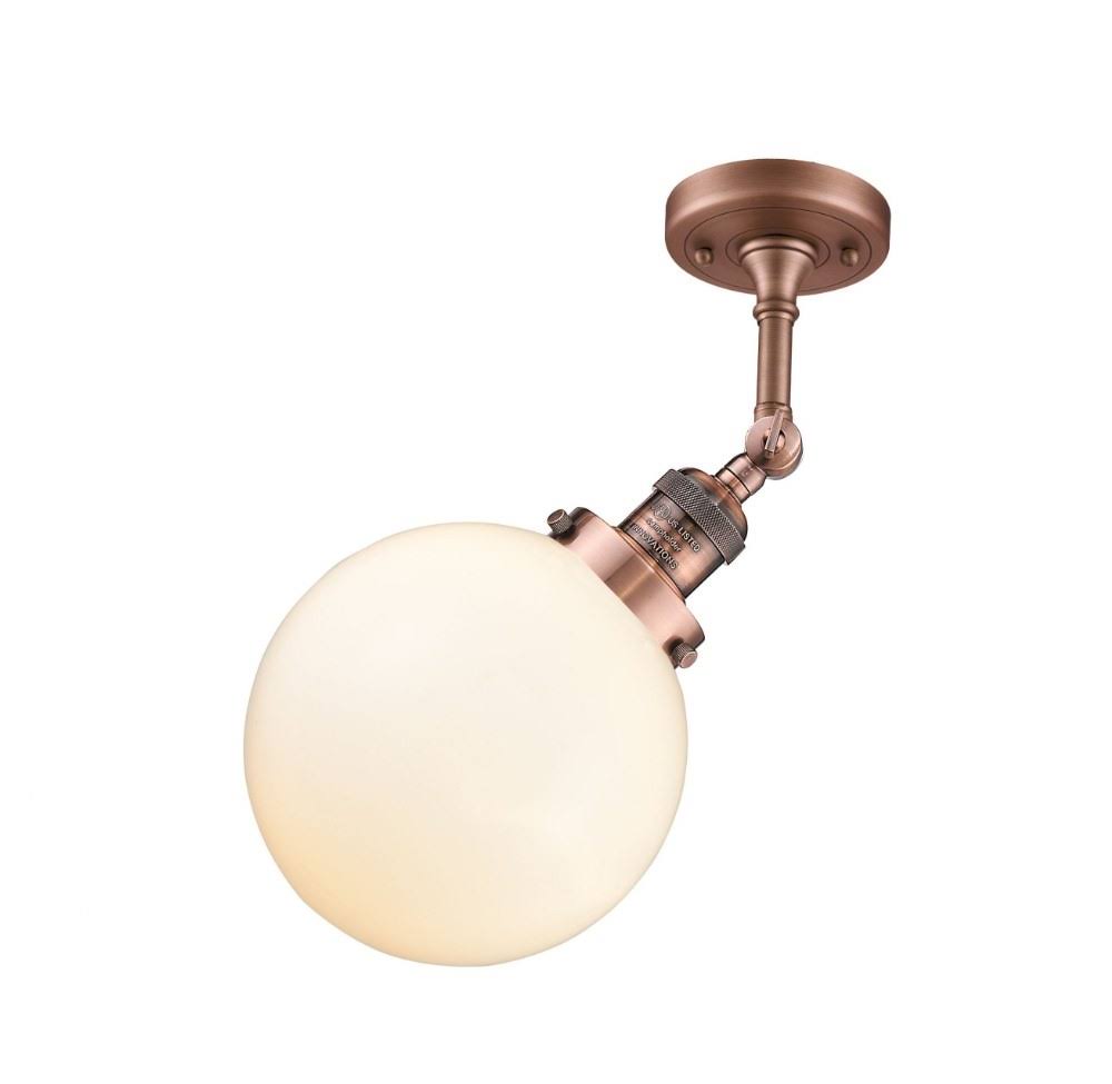 The Beacon One Light Seedy Glass Semi-Flush Mount add's a touch of vintage charm and sleek sophistication to any space in your home with this elegant pendant. This indoor fixture is ideal for foyers, bedrooms, kitchens, office reception areas, restaurants, hotels, shops and other indoor areas, including those with high ceilings. Cast brass and glass construction Ceiling mount installation Socket Type: Medium Base Maximum Voltage: 120V 100 Watts per socket Number of Bulb: 1 4 1/2 canopy diameter Fitter Measurement: 3 1/4 Lumens: 296 Shade shape: Globe Shade size: 8 X 7.75 Safety rated for damp location ETL and UL listed
