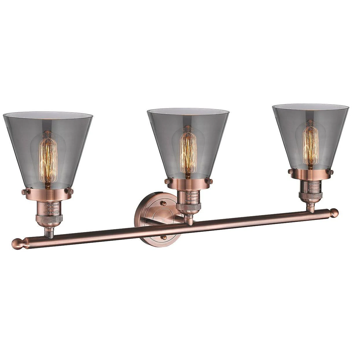 This 3 light Vanity Light from the Signature collection by Innovations Lighting will enhance your home with a perfect mix of form and function. The features include a Antique Copper finish applied by experts. Product Features Include: Brand: Innovations Lighting Collection: Signature SKU: 205-AC-G63 UPC: 636983981854 Category: Bathroom Vanity Lights Finish: Antique Copper Glass: Smoked Shade: Smoked Small Cone Width: 30.00 in. Height: 11.00 in. Extension/Depth: 8.00 in. Backplate/Canopy Width: 4.50 in. Backplate/Canopy Length: 4.50 in. Backplate/Canopy Thickness: 0.75 in. Height from Center of Wall Opening: 2.25 in. Install Position: Up or Down Weight: 6.65 lb.