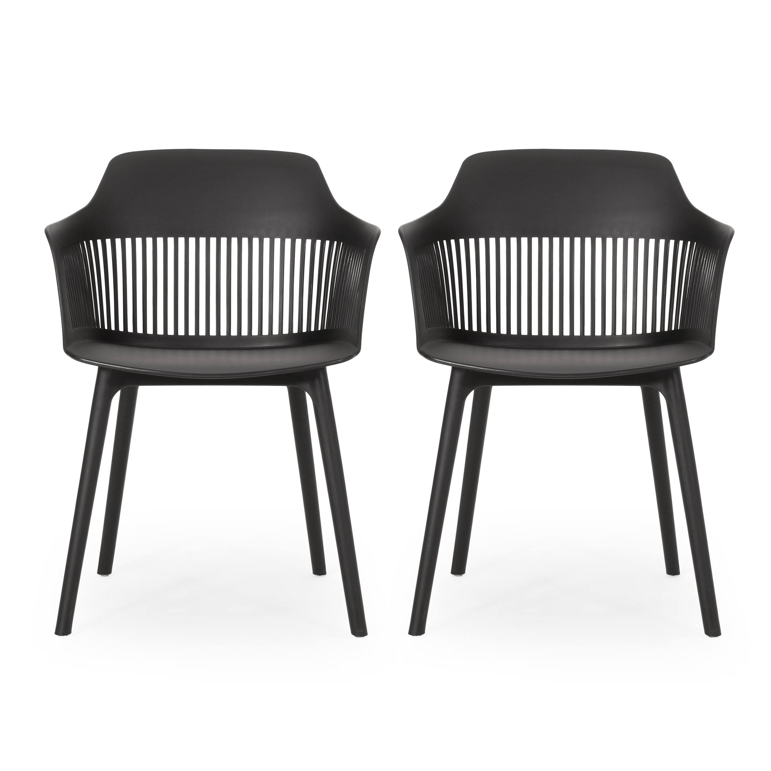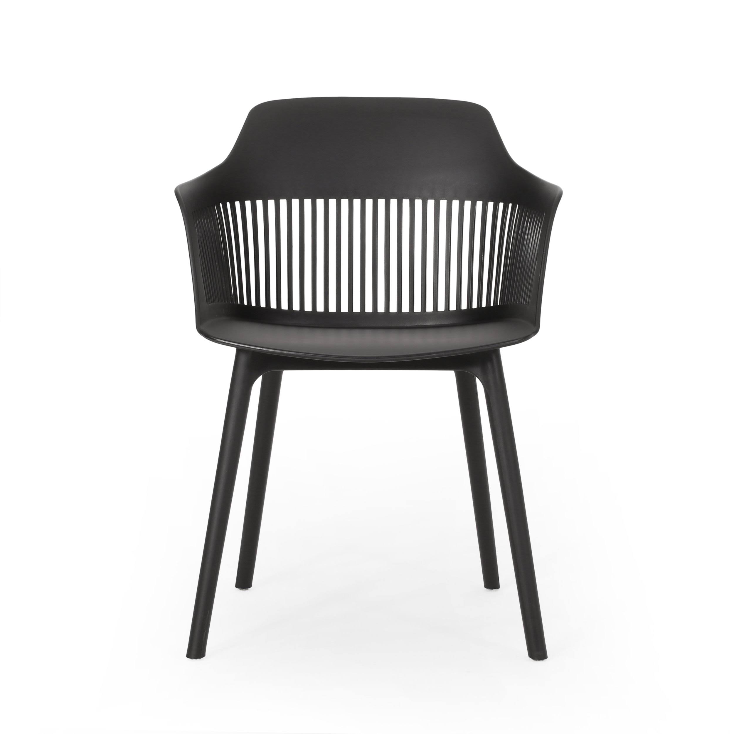 Why settle for a chair set that offers durability over style, or vice versa, when there is a set that offers both Featuring weather-resistant properties and a unique plastic blend material, our outstanding outdoor chair set provides astonishingly stable frames that will last you for years to come. This minimalistic design balances clean-cut lines and elegant curves to create an impressive look of sturdy structure and stylish comfort. Finished with a modern vibe, our chair set is sure to transform any backyard space into a refined masterpiece. MODERN DESIGN: With clean, precise lines, our arm chair is the ideal modern accessory for your outdoor space. Finished with a clean, curvaceous frame and open slat accents, each chair not only offers a chic, minimalistic look but also provides incredible structure. POLYPROPYLENE RESIN: Created with high-quality, specially designed polypropylene, our chair set is made to be highly durable and weather-resistant. Each individual component of our polypropylene blend is specifically chosen to create a unique mixture that ensures that your product is of the best quality. WEATHER-RESISTANT SET: Our set consists of weather-resistant material, known to repel water and resist sunlight. This durable set offers easy maintenance so you can spend all summer lounging outdoors in comfort. DIMENSIONS: Choose an accessory that is the perfect size for you and your furniture. Each chair is 22.50 W x 21.50 D x 33.00 H. You will love how much your space can transform with the simple addition of this charming chair. ASSEMBLY REQUIRED: Some assembly is required for this chair set. All of the instructions and tools needed for assembly are included. This comes as a set of two. Includes: Two (2) Dining Chairs Material: Polypropylene Resin Color: Black / Teal Hand-Crafted Details Assembly Required Dimensions: 21.50 inches deep x 22.50 inches wide x 33.00 inches high Seat Dimensions: 17.50 inches deep x 18.50 inches wide x 17.50 inches high