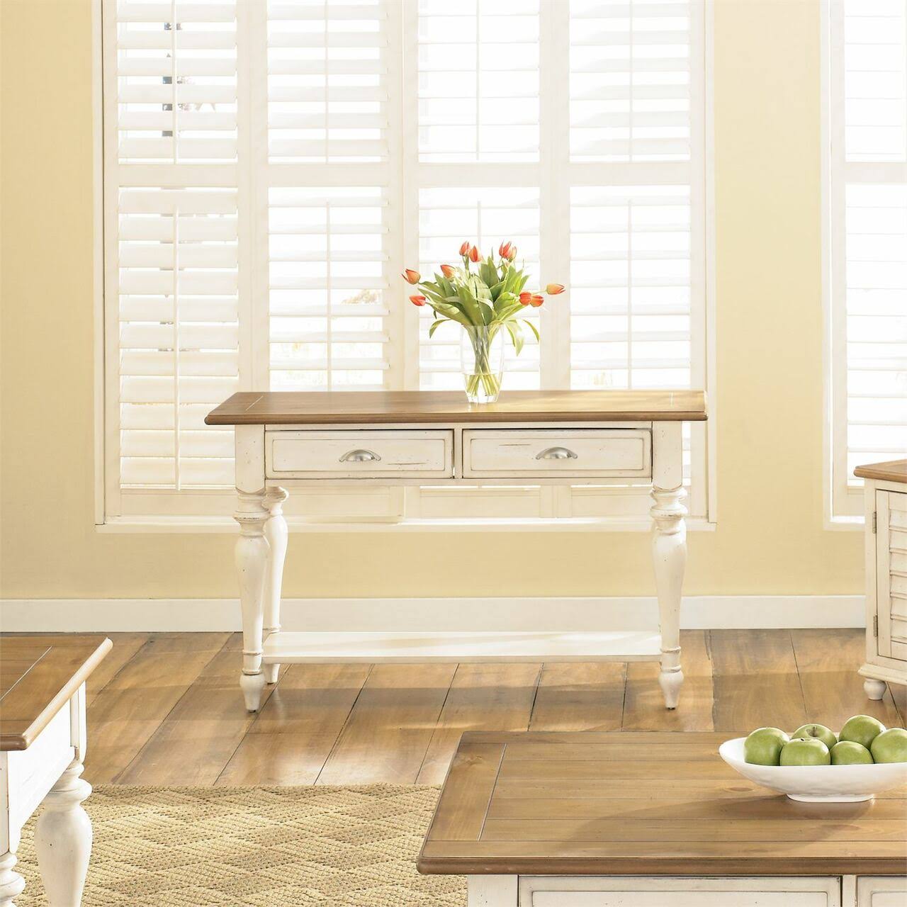 Design is not just about how something looks but also how it makes you feel. A glowing sunset, thetexture of a sand beach, smells of the salt air, all these can be inspirations for decorating your home. Ocean Isle createsa relaxed interior look that works for coastal styles, county, & cottage interiors. A soft Bisque finish combined with natural pine tops create a nice contrast accented with satin nickel cup pull hardware. Casual style upholstery would be enhanced with the Ocean Isle occasional. Meant for a family room that is lived in, theplanked pine top occasional only looks better with age. The cocktail features turned legs with two storage drawers forremotes and a bottom shelf for magazine. Add in a drawer end tale and chairside chest with a louvered door and yourroom is complete.