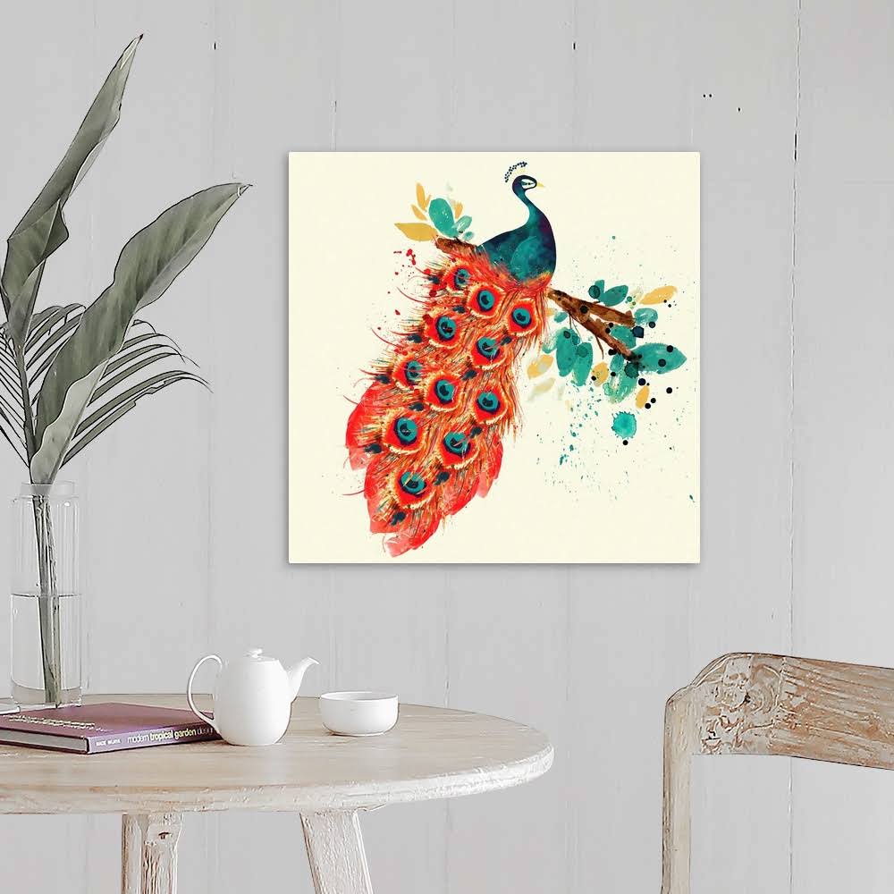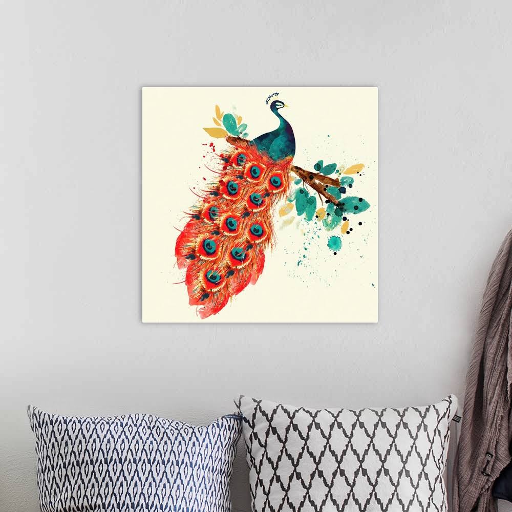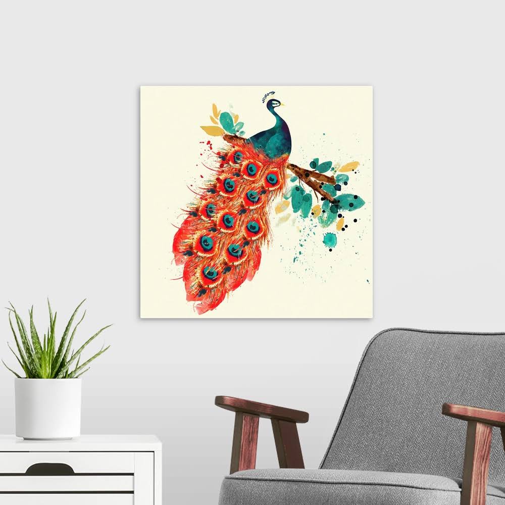 Contemporary artwork of a peacock on a branch with red tail feathers. Multiple sizes available. Primary colors within this image include Black, White, Red, Peach. Made in the USA. All products come with a 365 day workmanship guarantee. Inks used are latex-based and designed to last. Canvas depth is 1.25 and includes a finished backing with pre-installed hanging hardware. Archival inks prevent fading and preserve as much fine detail as possible with no over-saturation or color shifting.