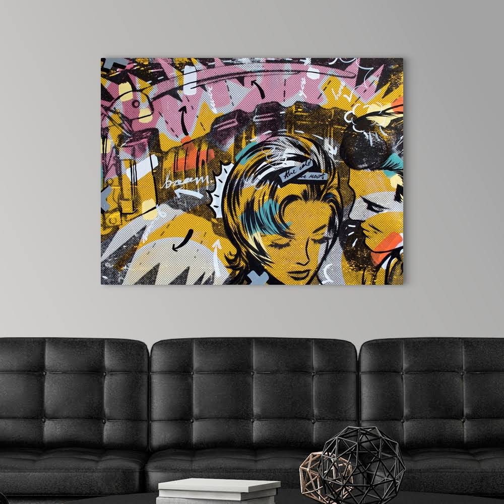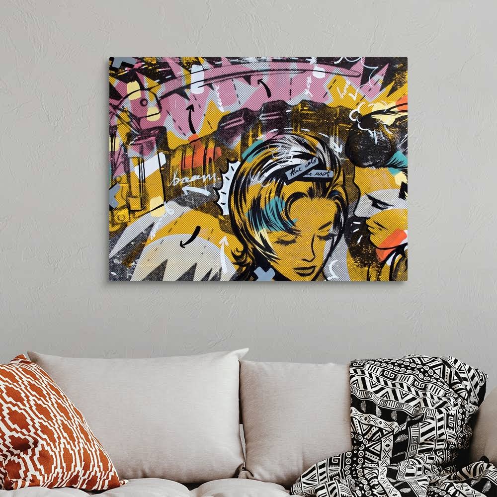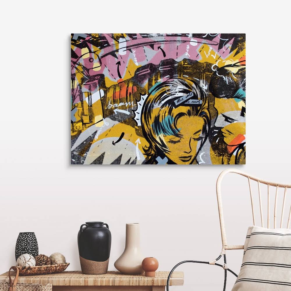 Pop art composed of comic illustrations and bold text, reminiscent of Lichtenstein, of a man whispering to a woman. Multiple sizes available. Primary colors within this image include Orange, Brown, Light Yellow, Black. Made in the USA. Inks used are latex-based and designed to last. Canvas depth is 1.25 and includes a finished backing with pre-installed hanging hardware.