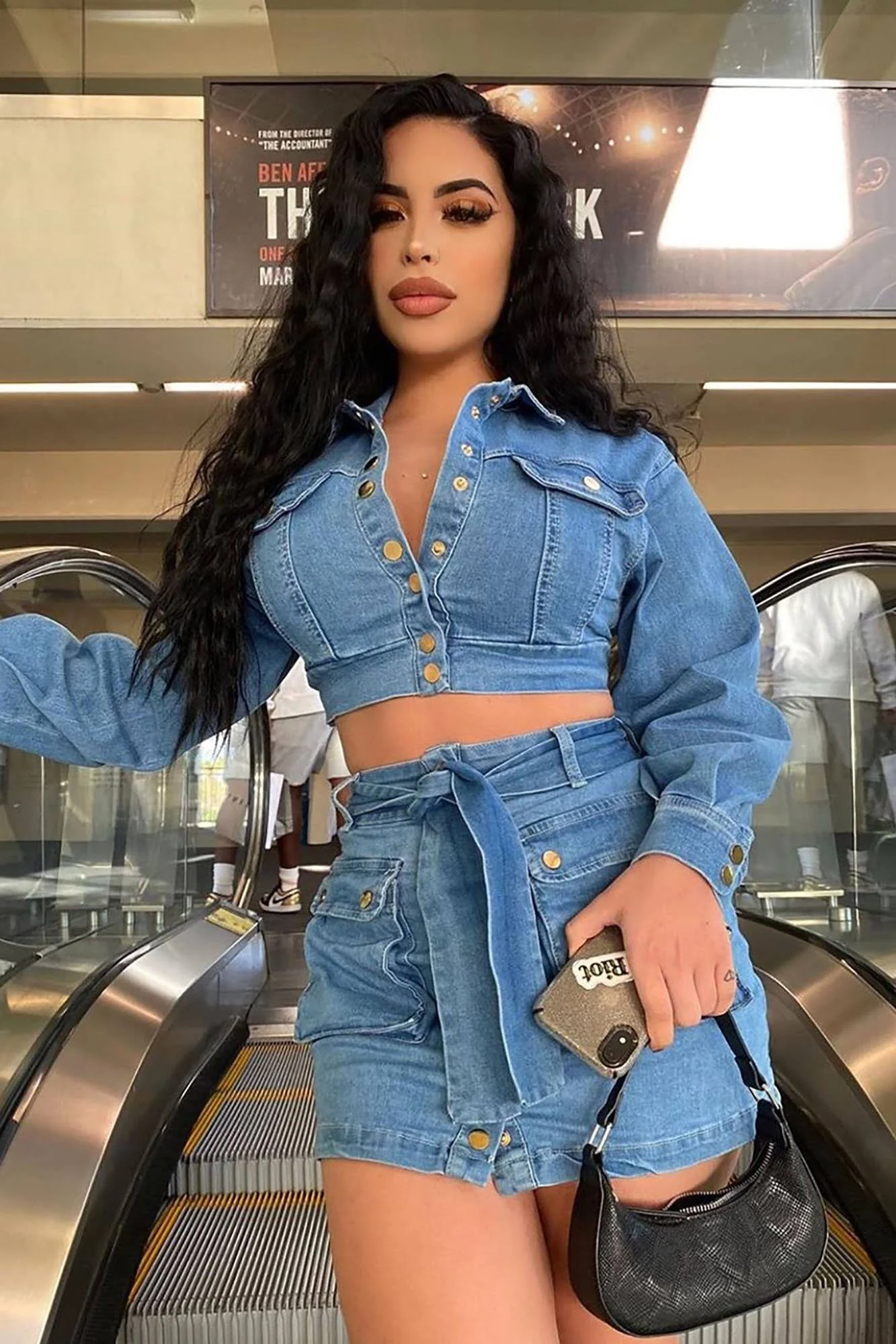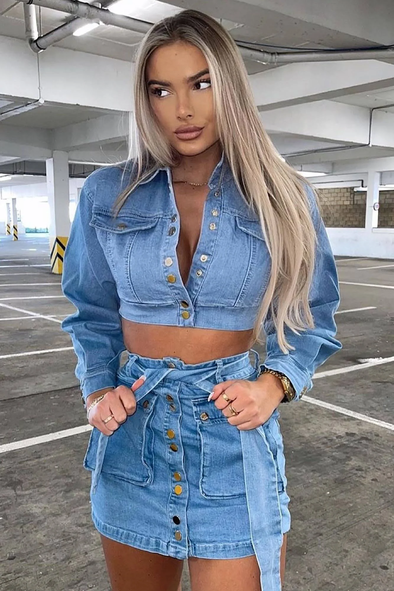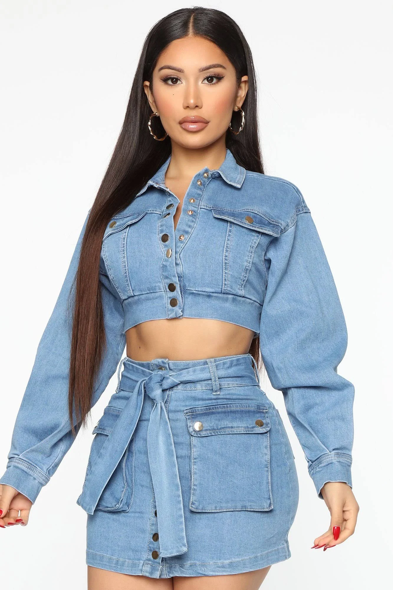 Available In Blue Denim Matching Set Cropped Jacket Collar Balloon Sleeve Button Down Snap Buttons Mini Skirt Tie Belt Utility Pockets Snap Button Closure Disclaimer: Due To The Specialized Wash Process, Each Garment Is Unique. 98% Cotton 2% Spandex Imported | Denim On Denim Matching Skirt Set in Blue size Medium by Fashion Nova